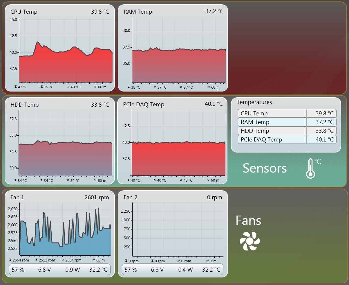 The image below shows the aquaero software environment that is set up to measure temperatures at the CPU, RAM, hard drive, and PCI Express DAQ board. This environment is configured to regulate the speed of “Fan 1” to keep the PCI Express DAQ board at 40 °C. Monitoring the DAQ board’s onboard temperature sensor showed that this method kept the board temperature regulated within ±0.25 °C. This is a significant performance boost considering that without intelligent cooling the board’s temperature varied by as much as 5 °C, depending on the intensity of the task being performed. Tighter temperature regulation translates to lower thermal drift and better accuracy of your DAQ device.