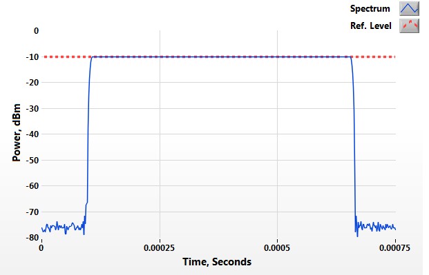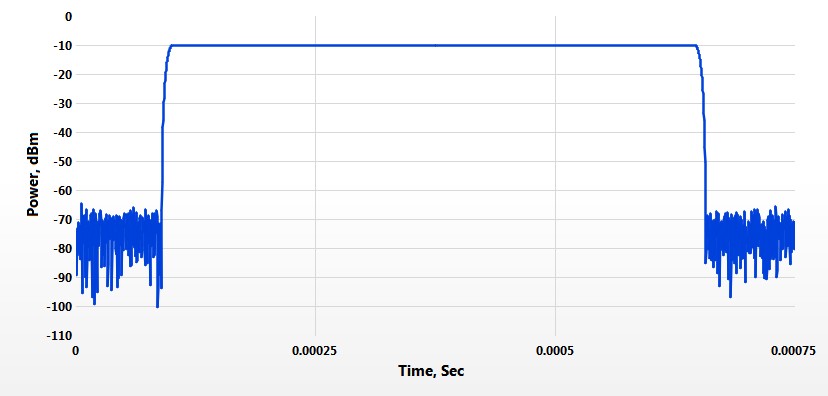 In Figure 1, notice the PvT plot is not a complete representation of the GSM signal itself, but a representation of the envelope power as measured through a bandpass filter across a period of time. For the GSM burst in Figure 1, the power in the active portion of the burst is -10 dBm.