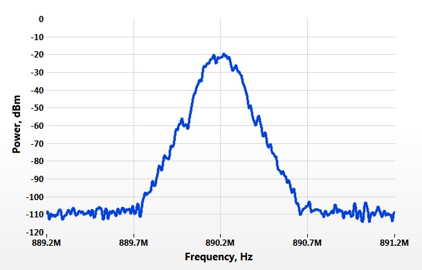 Now compare Figure 1 with the corresponding spectrum associated with the same signal in Figure 2. While the power is constant, much like a Continuous Wave (CW), the signal occupies some non-zero bandwidth in frequency. The bandwidth of the signal is usually declared as a percentage of total power acquired, since the bandwidth of the GSM signal is technically infinite.