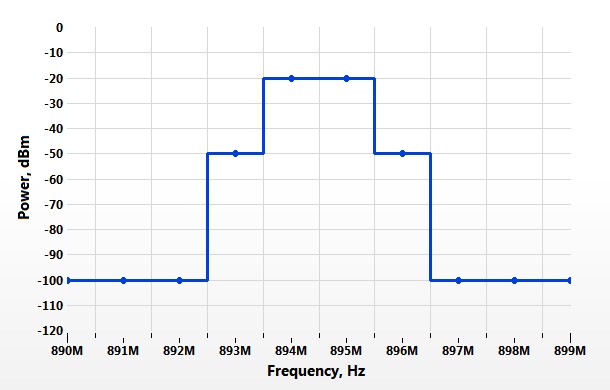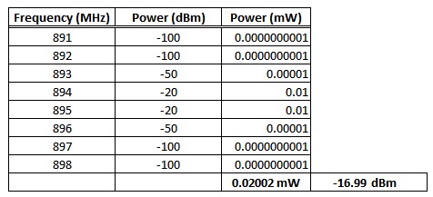 Adding up the power in Watts from the table above gives approximately 20 mW. Now convert that to dBm as shown below using the equation above. The power at 893M and 896M are -30dB from the primary power at 894M and 895M, and contribute a negligible amount of power to the overall signal.