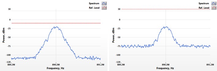 Figure 10. Left: GSM spectrum with an appropriate reference level. Right: GSM spectrum with a reference level set too low.