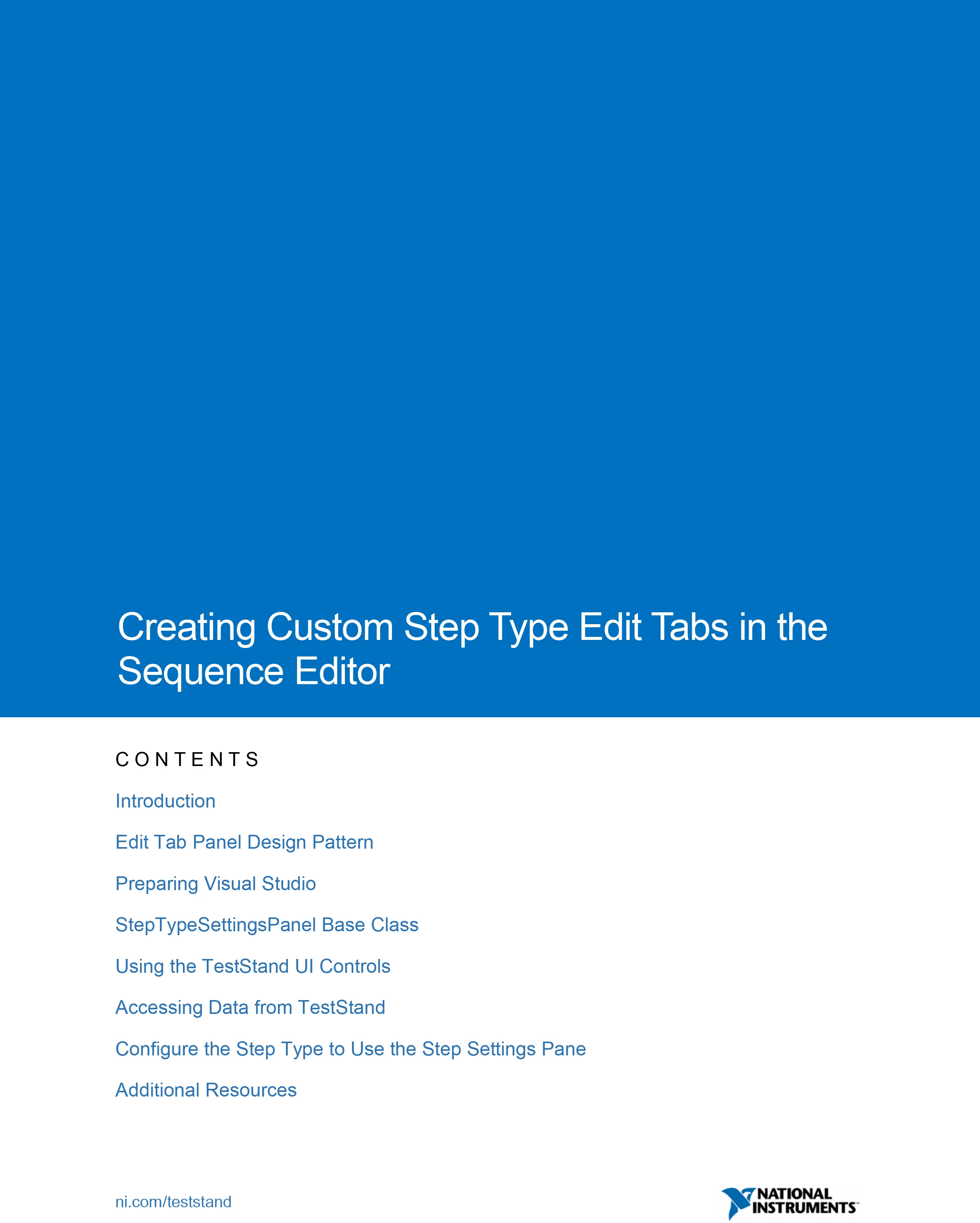 TestStand offers access to the same APIs used to develop our included step types with .NET languages. This allows you to develop an integrated edit tab panel as an alternative to an edit substep. If you are new to custom step type development, you should read the TestStand Advanced Architecture series topic, Best Practices for Custom Step Type Development, as the same design principles apply to custom step types that use an edit substep or an integrated edit tab panel. This document will cover the design pattern of the edit tab panel, requirements for developing a panel, and the necessary APIs used. While Edit tab panels can be developed and built with any environment that can compile against the .NET Framework, this document will focus on the use of C# with Visual Studio.