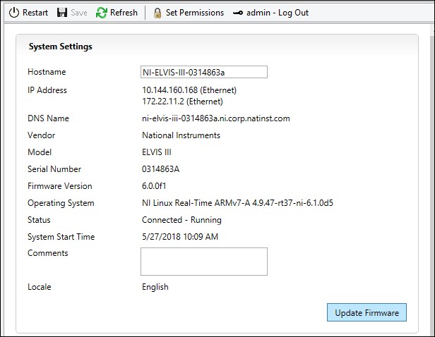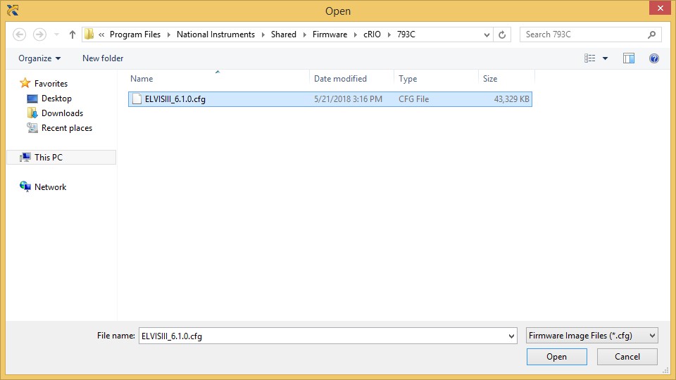 Click the NI ELVIS III target in the configuration tree, and then click the Update Firmware button in the System Settings section. MAX automatically navigates to the latest firmware file for the NI ELVIS III. Firmware files for the NI ELVIS III are named ELVISIII_<version number>.cfg. For example, ELVISIII_6.1.0.cfg.