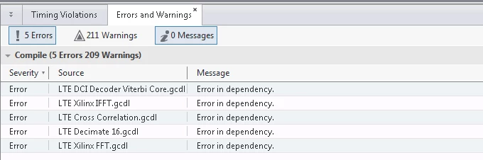 Figure 23: Error list showing affected files for Xilinx IP Core reconfiguration