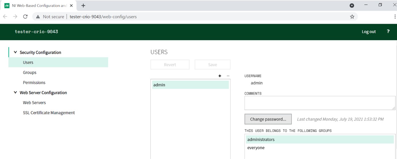 After logging in using the default credentials, you will see the Users page. Change the default password for the admin account to something other than a blank password to prevent unauthorized users from gaining access. You can then create other user accounts and organize user accounts into groups. You can set permissions on a user and/or group basis. Ultimately, you want to use security settings to limit user and group access to the Web-based Configuration and Monitoring Tool based on their needs and responsibilities.