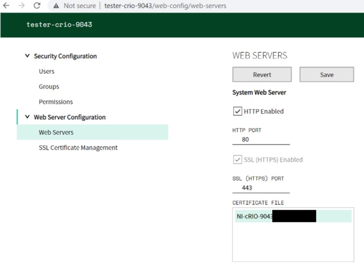 To enable SSL, navigate to the Web Configuration and Monitoring Tool as described in the security settings section. Select the Web server from the gear icon drop down menu and click the “SSL Enabled” checkbox. The System Web Server hosts the Web-based Configuration and Monitoring Tool. Securing the System Web Server secures all communications to the Web-based Configuration and Monitoring Tool, protecting information such as filenames and device locations when uploading or downloading files to/from the RIO device. The Application Web Server hosts your Web Services , and can be used to secure application data that you are passing between the host PC and the RIO device.