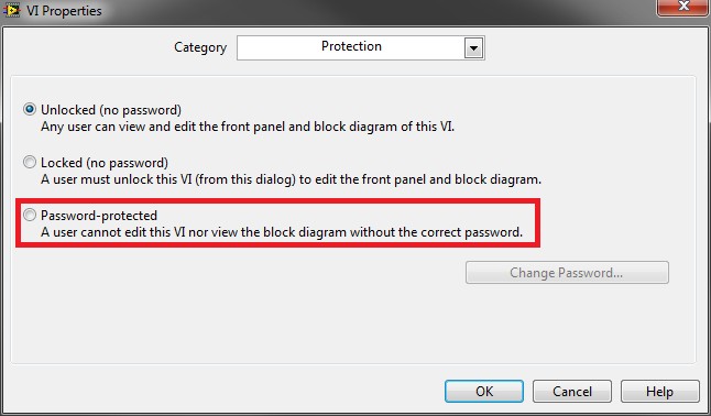 To set a password on a VI, open the VI and navigate through File » VI Properties. In the dialog box that opens, select Protection from the drop down Category list. On this page, you can select Password-protected to set a password for the VI.
