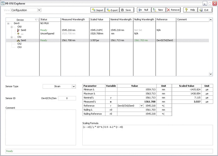 For all strain FBGs, the scaling formula includes temperature compensation. In order to perform temperature compensation a second FBG (temperature) will need to be used. The Temperature FBG will be a reference to the strain FBG in NI-OSI Explorer.