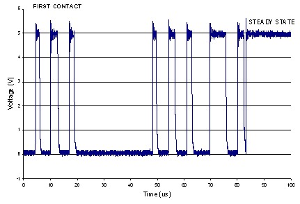Armature and reed relay contacts “bounce” when they close. When closing, the contacts touch momentarily, making and breaking continuity, until finally remaining in the closed position. The concept of bouncing is analogous to that of a ball being dropped on the floor. When the ball is dropped it bounces for a few seconds before it gives up to the force of gravity and settles on the floor’s surface. Electromechanical relays are made up of contacts which meet each other to make or break the circuit. Since these contacts are made of metal, they have some mass. Furthermore, at least one of these contacts lies on a movable strip of metal which has springiness. Both these factors cause relay contacts to bounce as they make or break a connection. Figure 4 demonstrates relay bounce.