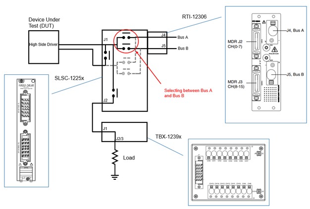 The signal passes through the module, where the fault can be inserted by switching certain relays, and then couples to a load using either a custom load box or and standard terminal block (TBX-1239x). The SLSC-12251/2 requires an RTI-12306 for connecting to the fault busses. The diagram below shows the signal path from the DUT through to a load, the relays are controlled via the SLSC bus using software. More information on the software is described in the software section.