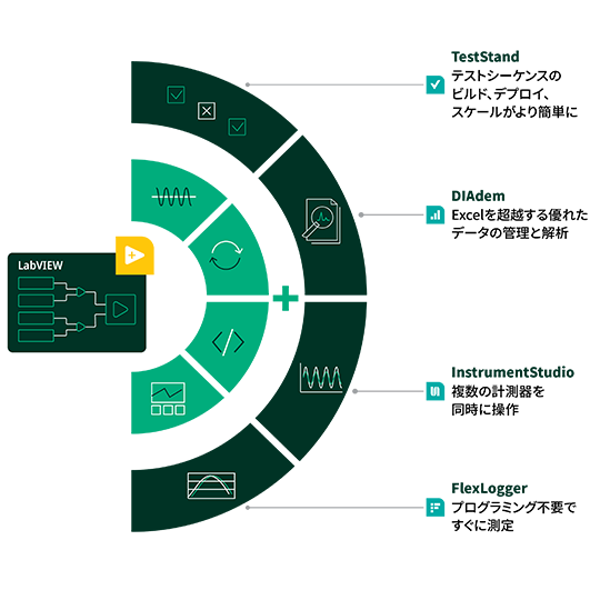 LabVIEW+ Suiteは、NIテストソフトウェアの最高の機能をまとめたもので、ワークフローのあらゆる部分を最適化してエンジニアの時間を節約します。各ソフトウェアには、テストを高速化するために設計された機能が含まれています。