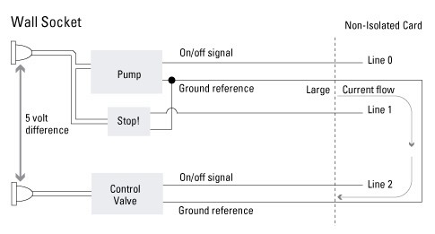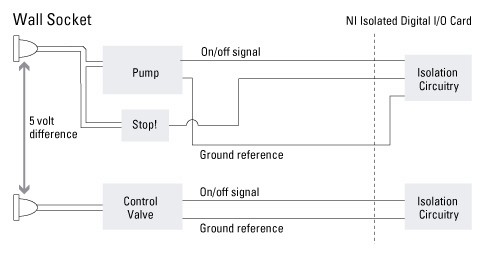 科学色素の混合は、色素および染料用に無機化学薬品を混合するプロセスです。薬品の流量ポンプおよび水力制御バルブは、使用される2つの薬品の流量を制御します。ポンプとバルブにはそれぞれ接地基準があり、ポンプは同じ接地基準を持つ緊急停止スイッチに接続されています。さらに、2つの接地基準は5 V異なります。