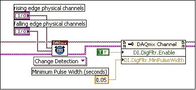 変化検出を使用するプログラムはNI-DAQmxで簡単に作成できます。「NI-DAQmxタイミング」VIには新規の多態性インスタンスが含まれており、他のバッファ型NI-DAQmx入力操作と同様に変化検出を処理します。(図3)変化検出に使用するラインはプログラマが制御することが可能です。立ち上がりエッジおよび立ち下がりエッジライン制御器は、デバイスに物理的に存在する入力ラインの組み合わせで生成できます。次のセクションでは、変化検出をデジタル入力フィルタ処理とともに使用すると、さらに便利であることを説明します。
