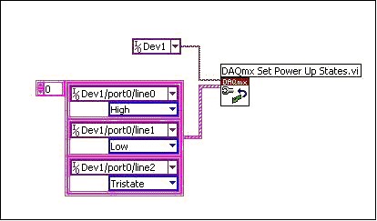 新しいNIデジタル製品では、デバイスのEEPROMにプログラム可能な電源投入時の状態が実装されました。EEPROMの電源投入時の状態は、2通りの方法のいずれかでプログラムで変更することができます。A) 「NI-DAQmx電源投入時の状態を設定」VIをLabVIEWで実行(図5)。VIが実行されると、設定がEEPROMにダウンロードされます。