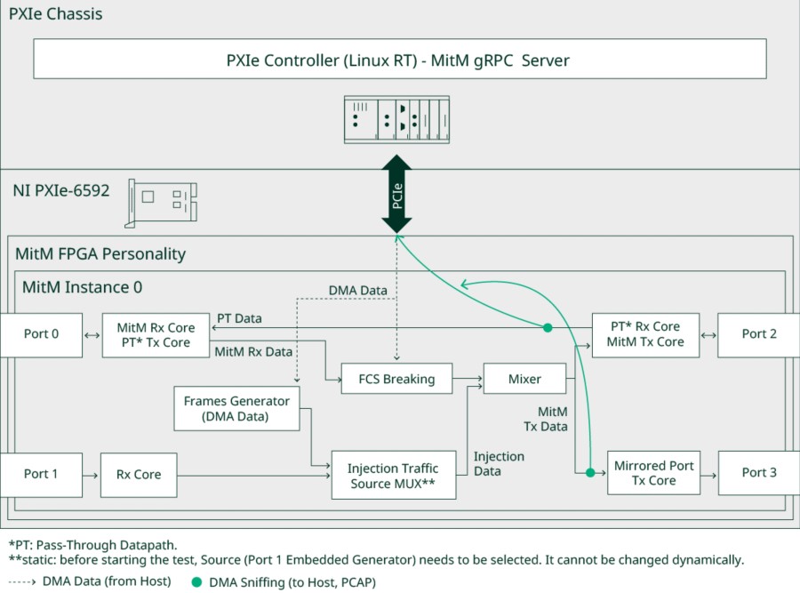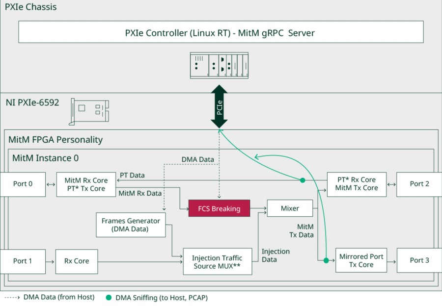 NI 모듈형 플랫폼은 자동차 이더넷 트래픽을 높은 성능과 타이밍 결정성으로 컨트롤하도록 설계되어, 스케일에서 수동(man-in-the-middle) 테스트를 가능하게 합니다. 기존의 NIC 기반 솔루션과 달리, 이 플랫폼은 FPGA 레벨의 유연성을 PXI의 동기화 및 확장성과 결함 삽입, 타이밍 분석, 프로토콜 검증에 이상적입니다. 시스템의 핵심에는 리얼타임 프레임 조작을 위한 특수 하드웨어와 자동화, 원격 컨트롤, 딥 패킷 검사를 지원하는 소프트웨어 스택이 통합되어 있습니다.