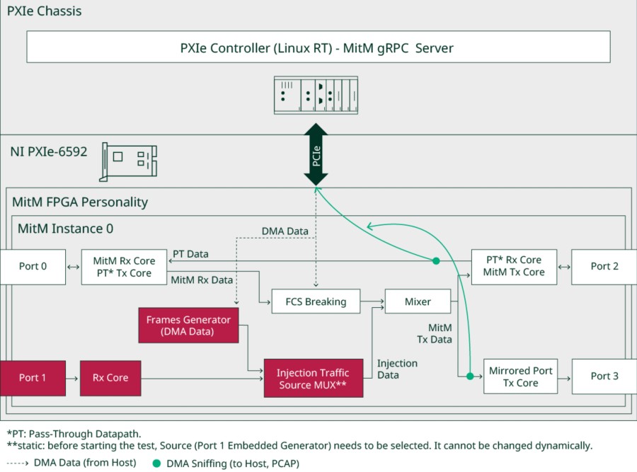 스트레스 테스트를 위해 프레임을 생성하는 프레임 생성기(DMA)와 Port 1의 실시간 트래픽과 생성된 프레임을 혼합하는 Port Injection을 사용합니다.