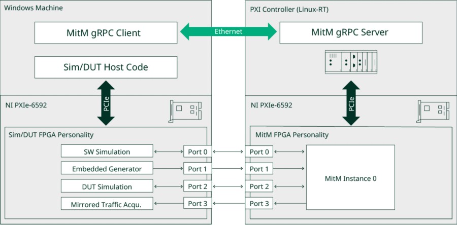 두 번째 PXIe-6592를 사용하여 MitM을 테스트합니다. 이는 “Sim/DUT”이라는 다른 FPGA 기능을 실행합니다.