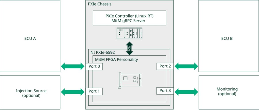 MitM 테스트는 두 통신 디바이스(일반적으로 ECU 또는 게이트웨이) 사이에 프로그램 가능한 테스트 시스템을 삽입하여 MAC 계층의 네트워크 트래픽을 절편하고, 조작하고, 분석합니다. 수동 모니터링과는 달리 MitM은 엔지니어가 실시간 트래픽을 조작할 수 있도록 해주며, 오류 허용오차 및 에러 핸들링 메커니즘을 검증하기 위해 컨트롤 중단 기능을 도입합니다.