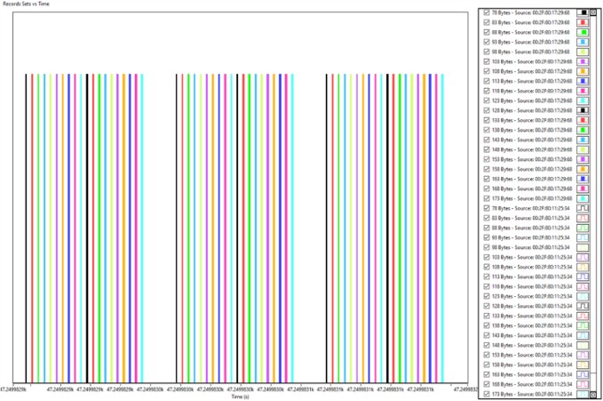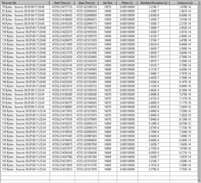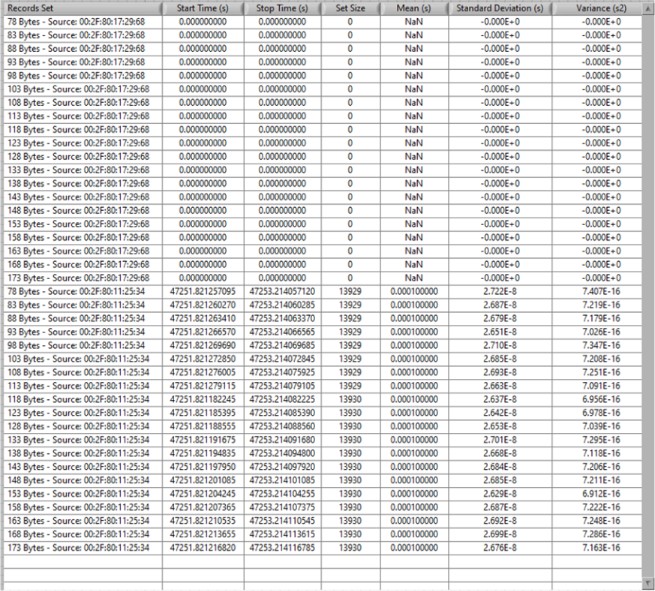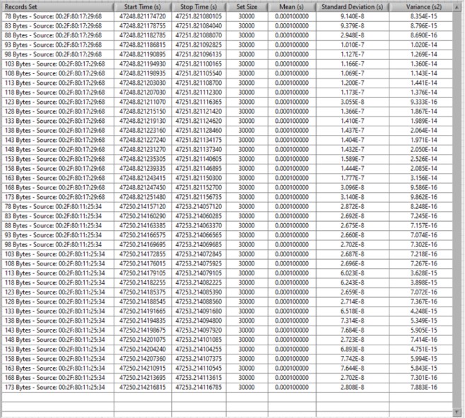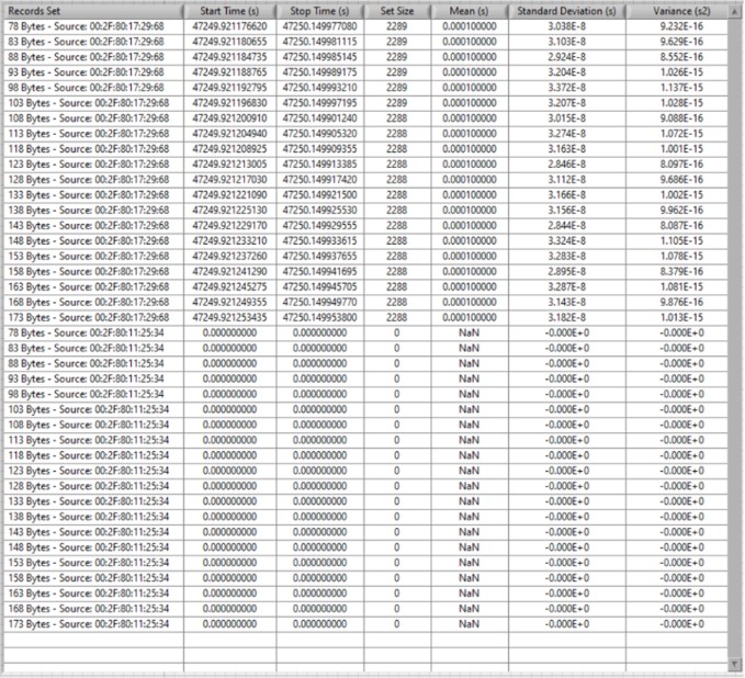 그림 15는 위상 1 동안의 데이터의 일부를 보여줍니다. 각 스트림의 주기의 평균, 주기의 표준편차(초) 및 분산(s2)을 계산합니다. 여기서는 MAC 소스의 00:2F:80:17:29:68 데이터만 보입니다. 프레임 생성기가 아직 실행 중이 아닙니다.