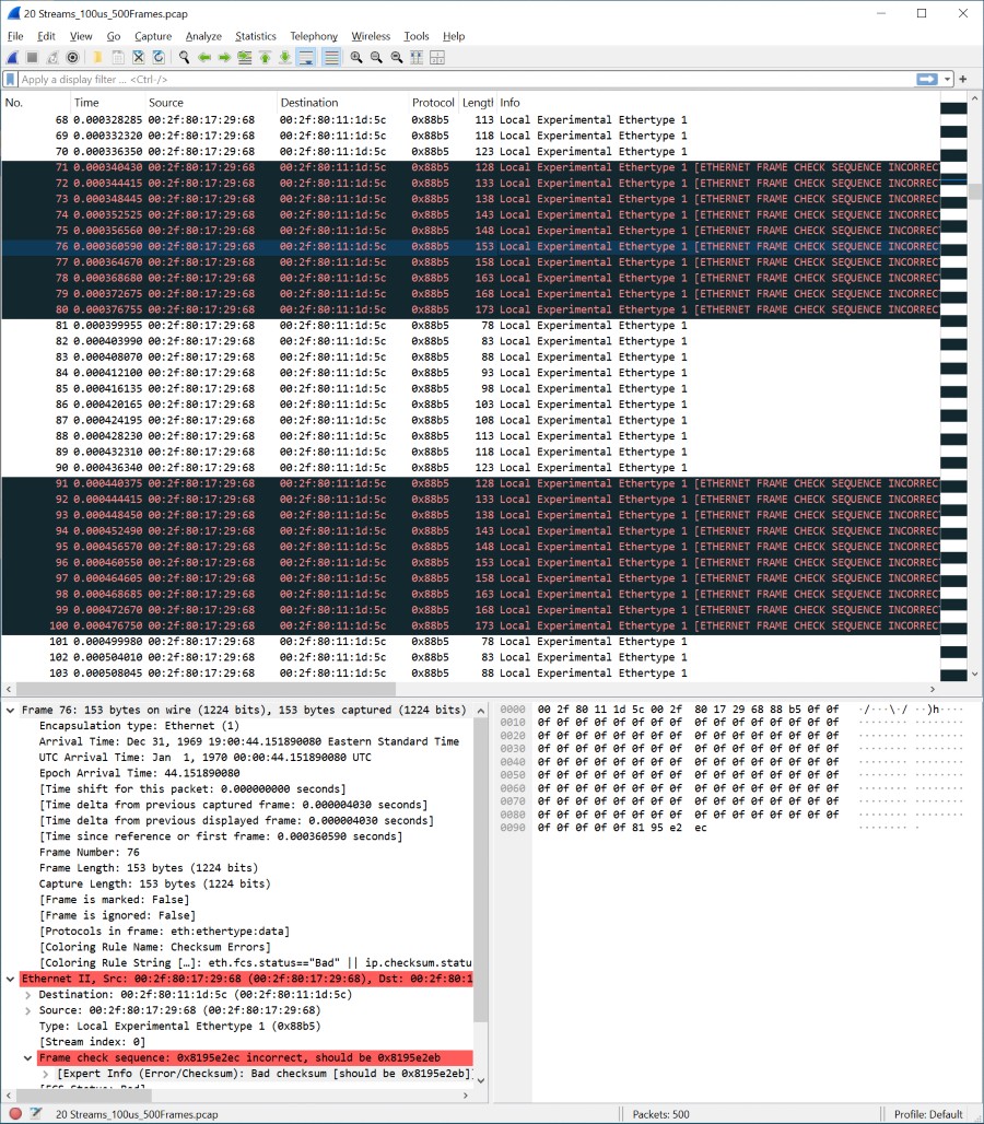 그림 10: N-Cycle 50% FCS 브레이크 모드 – 다른 모든 이더넷 프레임에서 FCS가 의도적으로 깨집니다.