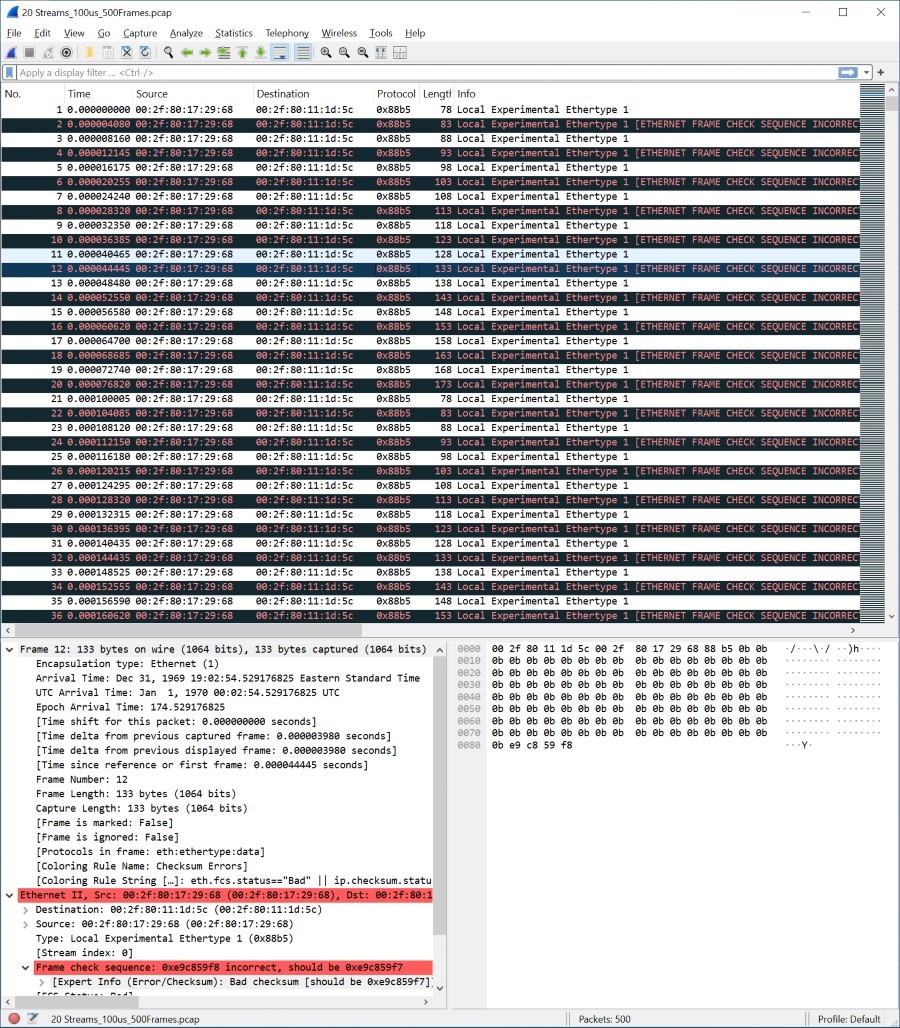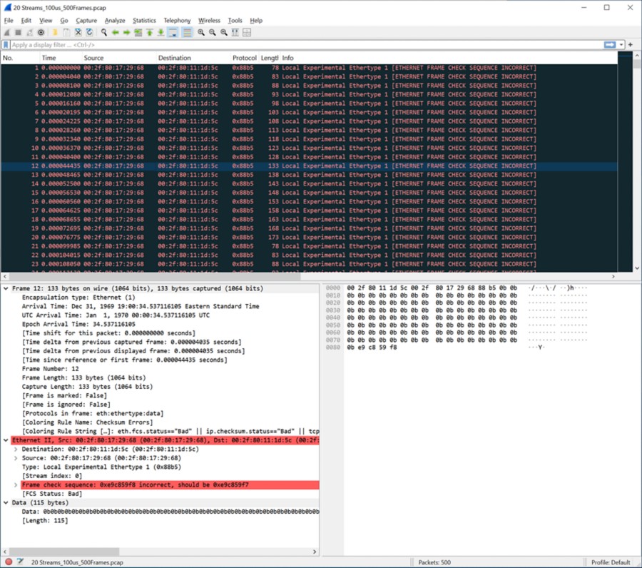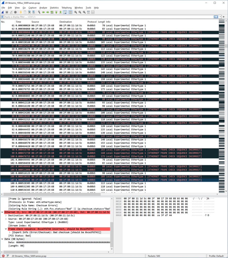 그림 7: 모든 활성화 FCS 브레이크 모드 모든 활성화 FCS 브레이크 모드 – 캡처된 모든 이더넷 프레임은 MitM 손상으로 인해 유효하지 않은 FCS를 표시합니다.