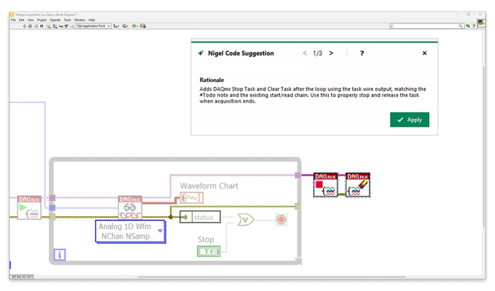 Nigel은 NI 소프트웨어에 내장되어 있어 직접 도움을 받을 수 있습니다. Nigel은 사용자의 프로젝트를 이해하기 때문에 사용자의 정확한 상황에 맞는 조언을 제공합니다. 따라서 인터넷에서 신뢰할 수 없거나 일반적인 답변을 찾을 필요가 없습니다. Nigel은 사용자의 작업을 이해하기 때문에 더 유용한 지침을 제공합니다.