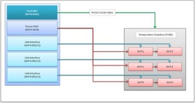 使用NI LabVIEW软件和PXI硬件,基于CAN信号采集待测设备(DUT)的数据,并借助单个前端软件来控制台式温度舱的温度设置。