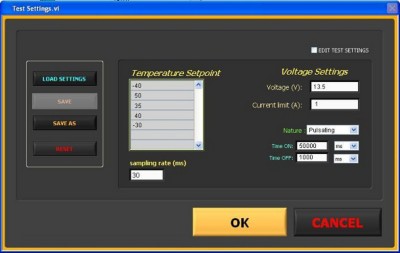 分析工程师输入测试设置(见图4),然后单击“OK”开始采集数据。系统会自动停止并将数据保存在本地硬盘中,因此,测试过程中并不需要工程师进行任何操作。测试完成后,系统便可以执行分析。NI软件和硬件产品非常适合我们的系统规格和配置。由于所有硬件(如控制器、SMU和CAN接口)均集成在一个紧凑的机箱中,因而减少了占用的测试实验室空间,这对于小空间应用是一个很大的优势。