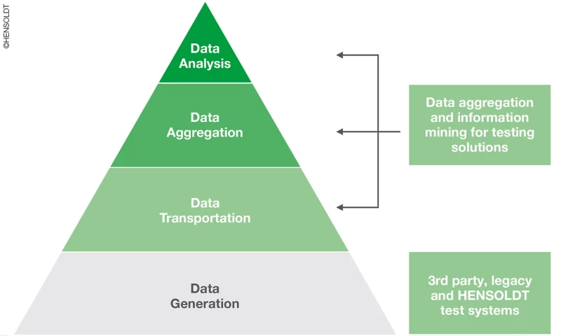 為讓資料產生層採用一致的標準,HENSOLDT 測試機平台的測試自動化中心 (TAC) 架構以 TestStand 為基礎產生所有資料。產生出資料之後,還要進行一套完整的數位流程,才能依據資料做出決策。要根據深入分析做決策,就必須經過資料傳輸、資料聚合以及資料分析等步驟。