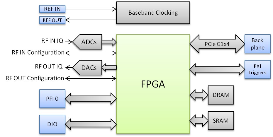NI PXIe-5644R FPGA 基卡 (basecard) 的組成元件包含 Xilinx Virtex-6 FPGA、基頻時脈電路、類比轉數位轉換器 (ADC)、數位轉類比轉換器 (DAC)、可設定功能的數位 I/O 通道 (PFI 0)、數位 I/O 接頭、PCI Express 介面、PXI 觸發器、DRAM、SRAM。