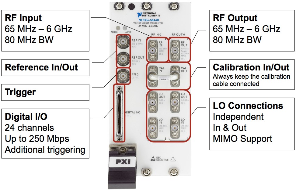 NI PXIe-5644R VST 結合了向量訊號分析器 (Vector Signal Analyzer,VSA) 與向量訊號產生器 (Vector Signal Generator,VSG) 常見的 RF I/O 功能,再加上 NI 或使用者所定義的功能,即可透過 FPGA 處理並控制訊號。RF 輸入與 RF 輸出都具有獨立的局部震盪器 (Local Oscillator,LO),頻率範圍從 65 MHz 至 6 GHz,瞬間頻寬則是高達 80 MHz。NI PXIe-5644R 屬於單一 3 槽式 PXI Express 模組 (參見下圖 1)。只要在單一 PXI Express 機箱中使用多個 VST 模組,即可建置多重輸入/多重輸出 (MIMO) 設定。
