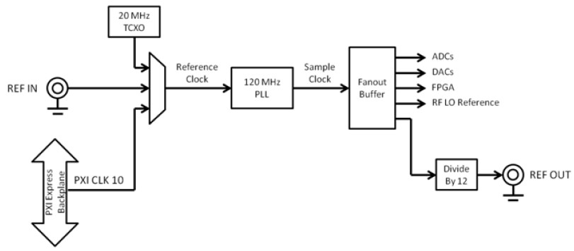 取樣時脈的速率為 120 MHz,並且由相位鎖定迴圈 (Phase-Locked Loop,PLL) 匯出。使用者可選擇內建的 TCXO、NI 5644R REF IN 人機介面接頭,或 PXI_CLK 10 做為 PLL 的參考訊號。取樣時脈則是 RF IN 與 RF OUT 內接 LO 電路的參考訊號 (參見下圖 4)。雖然取樣時脈頻率固定為 120 MHz,仍可使用 FPGA 的 Fractional Interpolation 與 Fractional Decimation DSP VI 達到高解析度 I/Q 資料傳輸率。