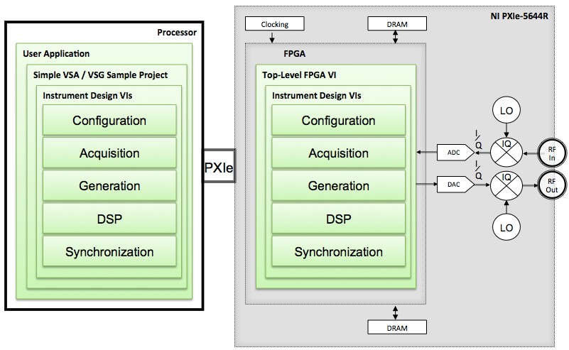 圖 3:LabVIEW 範例專案與 Instrument Design VI 搭配 NI PXIe-5644R 硬體程式方塊圖